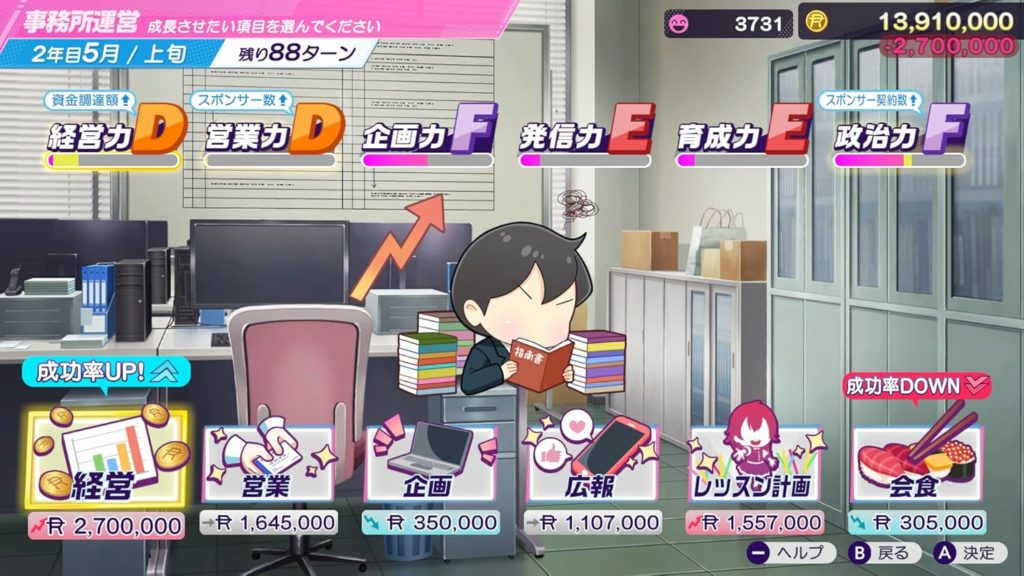 決められたターン数の中で、経営もアイドル育成もこなしていきます。